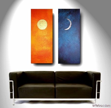 Auf Keilrahmen gespannt ist dieses außerordentlich schöne Diptychon mit Echtsilber und echtem Gold, 22 Karat aus der Werkreihe "Day and Night". Ein absoluter Blickfang! Herrliche Farben, beeindruckende Gestaltung und Ausführung. Im Original noch wesentlich eindrucksvoller! Dieses Bild eignet sich aufgrund seiner außergewöhnlich edlen Ausstrahlung auch für repräsentative Zwecke. Die Sonne wurde mit mit einer Auflage aus echtem Blattgold (mit garantiertem Feingehalt von 22 Karat) ausgestaltet, der Mond ist in echtem Silber gearbeitet. Gold und Silber schimmern je nach Lichteinfall unterschiedlich und wirken gerade in ihrer Kombination auch im Halbdunkel und bei Kunstlicht sehr ansprechend und geheimnisvoll. Die außergewöhnliche Farbkomposition harmoniert hervorragend mit den Edelmetallen. Die Seiten des Keilrahmens sind bemalt. Im Original findet der Betrachter eine größere Vielfalt an Zwischentönen und interessante, mehrschichtig gearbeitete Strukturen, die Farben sind wesentlich schöner und von einer großen Intensität und Leuchtkraft. Abhängig vom Gemäldestandort und der jeweiligen Tageszeit bzw. dem Lichteinfall enthüllt das Bild immer wieder neue Facetten seiner Ausstrahlung und Wirkung. Somit verwandelt es auf stimmungsvolle Weise auch die Atmosphäre des Raumes.