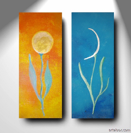 Technik: Acryl, Echtmetallpigmente auf hochwertiger Leinwand auf zwei Keilrahmen à 20 x 50; Serie/Titel: "Sun Flower & Moon Flower"; Diptychon im Format 40 x 50 cm ohne Zwischenräume; handsigniert. Es handelt sich bei dem Bild um ein intern registriertes Original. Die Rückseite der Leinwand ist mit Registriernummer und Stempel versehen. Bei eventuellem Verlust der Sendung wird der Kaufpreis voll zurückerstattet. Die verwendeten Materialien sind von bester Markenqualität und hoher Beständigkeit.