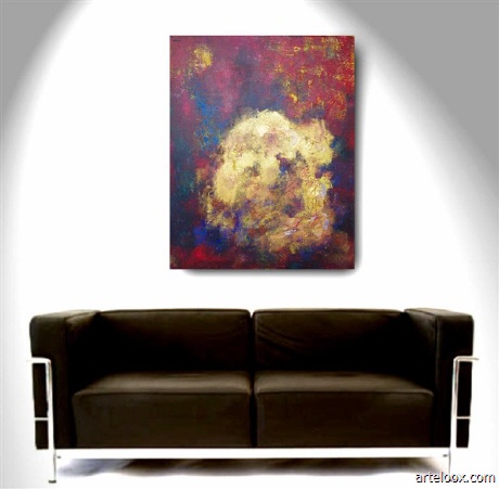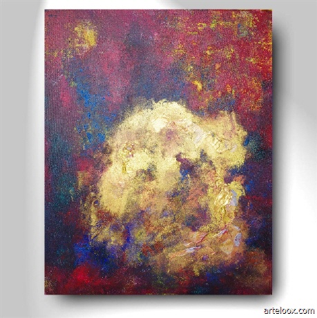 Die außergewöhnliche Farbkomposition harmoniert hervorragend mit dem Gold. Die Seiten des Keilrahmens sind bemalt. Im Original findet der Betrachter eine größere Vielfalt an Zwischentönen, die Farben sind wesentlich schöner und von einer großen Intensität und Leuchtkraft. Mehrschichtig gearbeitet, mit interessanten Strukturen. Abhängig vom Gemäldestandort und der jeweiligen Tageszeit bzw. dem Lichteinfall enthüllt das Bild immer wieder neue Facetten seiner Ausstrahlung und Wirkung. Somit verwandelt es auf stimmungsvolle Weise auch die Atmosphäre des Raumes.