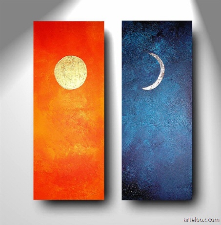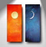 Auf Keilrahmen gespannt ist dieses außerordentlich schöne Diptychon mit Echtsilber und echtem Gold, 22 Karat aus der Werkreihe "Day and Night". Ein absoluter Blickfang! Herrliche Farben, beeindruckende Gestaltung und Ausführung. Im Original noch wesentlich eindrucksvoller! Dieses Bild eignet sich aufgrund seiner außergewöhnlich edlen Ausstrahlung auch für repräsentative Zwecke. Die Sonne wurde mit mit einer Auflage aus echtem Blattgold (mit garantiertem Feingehalt von 22 Karat) ausgestaltet, der Mond ist in echtem Silber gearbeitet. Gold und Silber schimmern je nach Lichteinfall unterschiedlich und wirken gerade in ihrer Kombination auch im Halbdunkel und bei Kunstlicht sehr ansprechend und geheimnisvoll. Die außergewöhnliche Farbkomposition harmoniert hervorragend mit den Edelmetallen. Die Seiten des Keilrahmens sind bemalt. Im Original findet der Betrachter eine größere Vielfalt an Zwischentönen und interessante, mehrschichtig gearbeitete Strukturen, die Farben sind wesentlich schöner und von einer großen Intensität und Leuchtkraft. Abhängig vom Gemäldestandort und der jeweiligen Tageszeit bzw. dem Lichteinfall enthüllt das Bild immer wieder neue Facetten seiner Ausstrahlung und Wirkung. Somit verwandelt es auf stimmungsvolle Weise auch die Atmosphäre des Raumes.